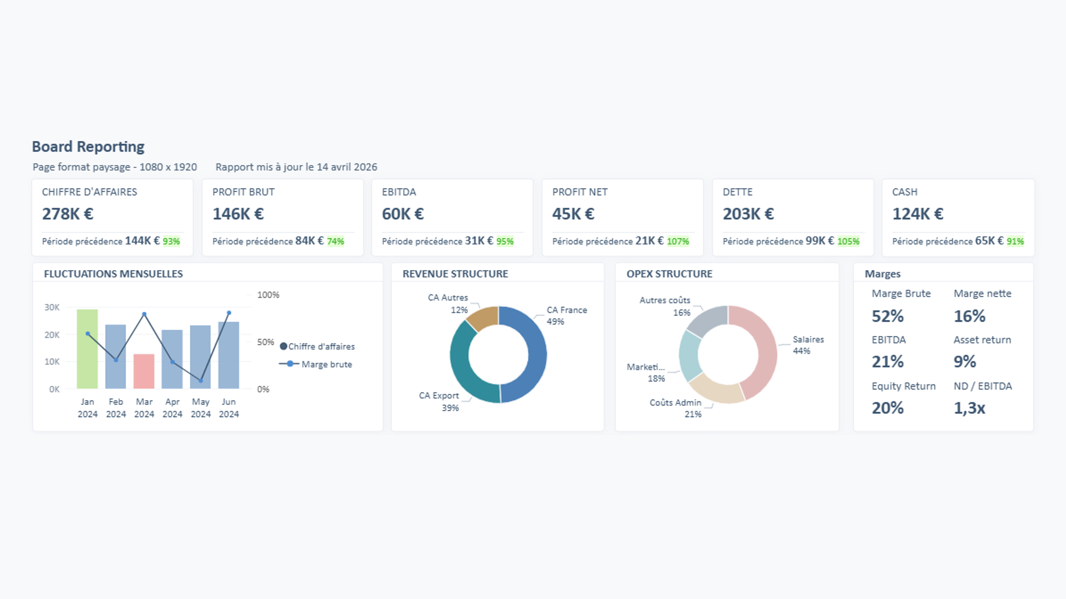 CA, Profit Brut, EBITDA, Profit Net, Dette et Cash avec comparaison N-1.
